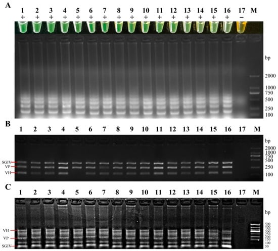 APA StyleLi, T., Ding, R., Zhang, J., Zhou, Y., Liu, C., Cao, Z., & Sun, Y. (2024). The Establishment of the Multi-Visual Loop-Mediated Isothermal Amplification Method for the Rapid Detection of Vibrio harveyi, Vibrio parahaemolyticus, and Singapore grouper iridovirus. Fishes, 9(6), 225. https://doi.org/10.3390/fishes9060225