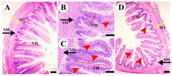 Photomicrographs of hematoxylin-eosin-stained cross sections of rainbow trout intestine under light microscope. (A,B) are control groups and (C,D) are B. subtilis-added groups. Abbreviation: villus height (VH), villus width (VW), sub-epithelial mucosa (SM), muscular thickness (MT). Red arrows point to goblet cells. The black scale is 100 μm.