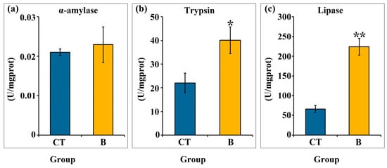 As shown in Figure 2, the digestive enzyme activities in the rainbow trout intestinal tissues were determined in the control and B. subtilis supplemented groups on day 42. The trypsin activity in group B was 40.08 U/mgprot, which was significantly higher than that in group CT (Figure 2b, p < 0.05). The lipase activity of group B was 224.33 U/mgprot, which was three times higher than that of group CT, and the difference was highly significant (Figure 2c, p < 0.01). However, there was no significant difference in α-amylase activities between the two groups.