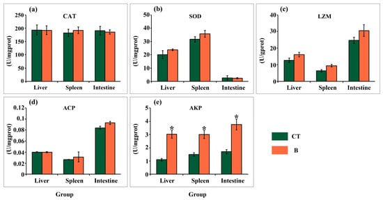Samples of liver, spleen and intestine of six fish from group CT and B on day 42 were selected for enzyme activity assay, respectively. For each sample, 0.1 g of tissue was placed in a 1.5 mL centrifuge tube, followed by the addition of 1 mL of 100 mM phosphate-buffered saline (PBS pH 7.4) and homogenized at 4 °C to break down the tissue cells. Finally, the homogenate was centrifuged at 12,000 rpm for 10 min, and the supernatant was removed and placed on ice for testing. The activities of three digestive enzymes in intestinal tissues were determined using three commercial assay kits including trypsin, α-amylase, and lipase (Grace Biotechnology, Suzhou, China). Catalase (CAT), superoxide dismutase (SOD), lysozyme (LZM), acid phosphatase (ACP) and alkaline phosphatase (AKP) activities in liver, spleen and intestine were determined using commercial assay kits (Grace Biotechnology, Suzhou, China) [,]. Calculation of enzyme activity was performed according to the kit instructions.