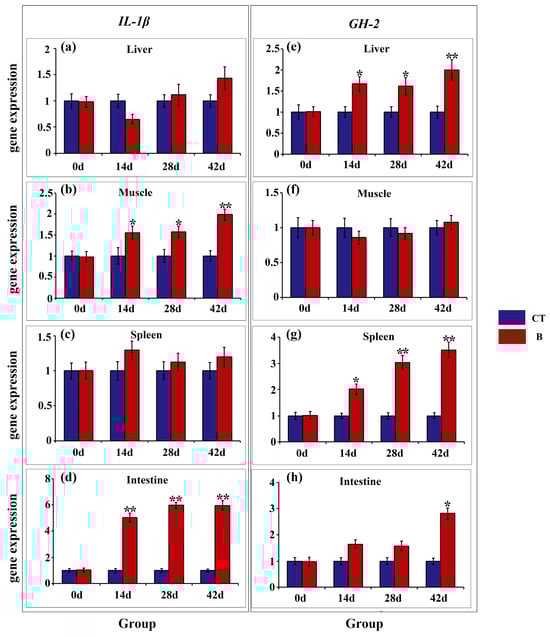 Expression levels of growth and immune-related genes in four tissues (liver, muscle, spleen, intestine) of O. mykiss. IL-1β: interleukin-1β (a–d); GH-2: growth hormone-2 (e–h). CT: control group; B: experimental group. All values were obtained from 6 individual fish (n = 6). * means the difference is significant (p < 0.05). ** means the difference is extremely significant (p < 0.01).