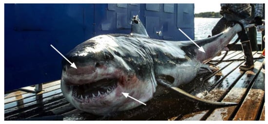 - Rigby, C.; Barreto, R.; Carlson, J.; Fernando, D.; Fordham, S.; Francis, M.P.; Jabado, R.W.; Liu, K.M.; Marshall, A.; Pacoureau, N. White shark (Carcharodon carcharias). IUCN Red List. Available online: https://www.iucnredlist.org/species/3855/212629880 (accessed on 18 April 2024).