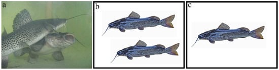 (a) Aggressive behavior between Steindachneridion parahybae females when kept in the same aquarium during the artificial spawning in captivity (CESP collection images); (b,c) schematic drawing showing the experimental design: (b) two S. parahybae females in the same aquarium; and (c) control group, one S. parahybae female in the aquarium. Broodstock female, 635 g (total body mass), Paraíba do Sul River basin, Paraibuna, São Paulo State, Brazil.