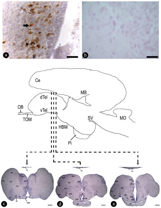 (a,b) Transversal sections through the preoptic area (POA) of Steindachneridion parahybae brain: (a) Arginine vasotocin (AVT) antiserum specificity was tested via antiserum alone; and (b) by preadsorption with an excess of antigen on successive 12 µm sections. Photomicrograph of the stained (immunostaining) with AVT neurons: (a) example of measured cellular area (black circle, arrowhead) and nuclear area (red circle, arrow); (c–e) lettered lines indicate the levels of the mains nucleus of the transverse sections of the anterior (c) to the posterior (e) region of POA (preoptic area), and (c) telencephalic region and their nuclei; (d,e) preoptic area and their key nuclei. AC, anterior commissure; Ce, cerebellum; Dc1, central part of the dorsal telencephalon, subdivision 1; Dc2, central part of the dorsal telencephalon, subdivision 2; Dc3, central part of the dorsal telencephalon, subdivision 3; Dc4, central part of the dorsal telencephalon, subdivision 4; Dd, dorsal part of the dorsal telencephalon; Dip, posterior division of the lateral part of the dorsal telencephalon; Dld, dorsal division of the lateral part of the dorsal telencephalon; Dlp, posterior division of the lateral part of the dorsal telencephalon; Dlv, ventral division of the lateral part of the dorsal telencephalon; Dm2, medial part of the dorsal telencephalon, subdivision 2; Dm3, medial part of the dorsal telencephalon, subdivision 3; Dm4, medial part of the dorsal telencephalon, subdivision 4; Dp, posterior part of the dorsal telencephalon; LFB, lateral forebrain bundle; NO, optic nerve; NPP, nucleus preopticus periventricularis; OC, optic chiasma; POA, preoptic area; POR, preoptic recess; Se, sulcus externus; TOM, medial olfactory tract; V, ventricle; Vd, dorsal nucleus of the ventral telencephalum; Vl, lateral nucleus of the ventral telencephalum; Vv, ventral nucleus of the ventral telencephalum. Transversal sections of pituitary and brain stained using acid haematoxylin (central area) (adapted from Honji et al. []). Ce, cerebellum; dTEL, dorsal telencephalum; HBM, medial basal hypothalamus; MB, midbrain; MO, medulla oblongata; OB, olfactory bulb; Pi, pituitary gland; SV, saccus vasculosus; TOM, medial olfactory tract; vTEL, ventral telencephalum. Scale bar: 10 µm (a,b); 400 µm (c–e).