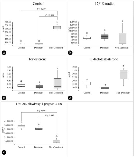 (a–e) Plasma sex steroid levels in control, dominant and nondominant Steindachneridion parahybae females during artificial spawning in captivity. (a) Plasma cortisol (Cort); (b) plasma 17β-Estradiol (E2); (c) plasma testosterone (T); (d) plasma 11-ketotestosterone (11-KT); and (e) plasma 17α,20β-dihydroxy-4pregnen-3-one (17α,20β-DHP). Data are presented as the mean ± mean standard error (mean ± MSE). n = 3 per experimental group. Values followed by letters are significantly different the dominant, nondominant females, and control group (p < 0.05).