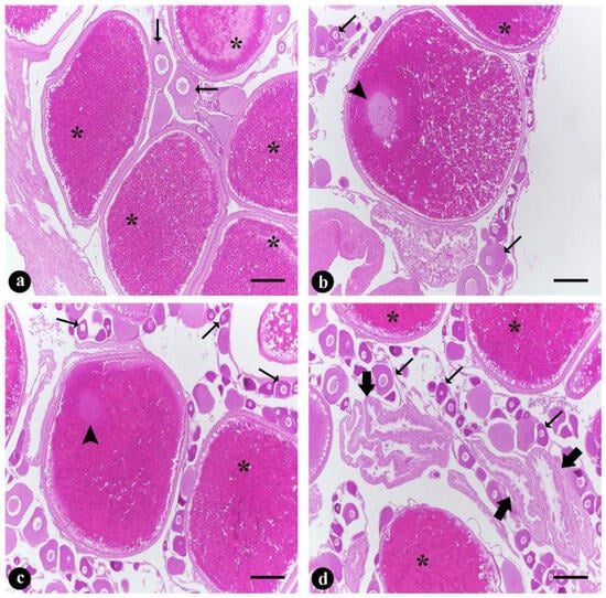 Histological analyses of the ovaries identified the following phases of oocyte development in females of all groups: vitellogenic oocytes (Figure 4a) with nuclear migration (Figure 4b,c) and postovulatory follicles (Figure 4d), in addition to several reserve oocytes (perinucleolar oocytes) (Figure 4). There were no qualitative differences between experimental groups in the histological analyses.