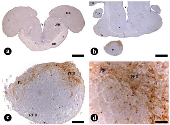 (a–d) Transversal sections through the preoptic area (POA) and pituitary (Pi) gland of Steindachneridion parahybae. Distribution of fibers immunoreactive (ir) with arginine-vasotocin (AVT) antisera (a–d). Details of strong and several fibers-ir lengthways with AVT antisera in the ventral POA area and Pi gland. At the Pi gland, mainly in proximal pars distalis (PPD) and pars intermedia (PI), while in rostral pars distalis (RPD). IL, inferior lobe; LFB, lateral forebrain bundle; OC, optic chiasma; P, pituitary gland; TEL, telencephalon; TLA, nucleus of the lateral torus; TO, tectum optic; V, ventricle; Scale bar: 100 µm (a,b); 50 µm (c); 10 µm (d).
