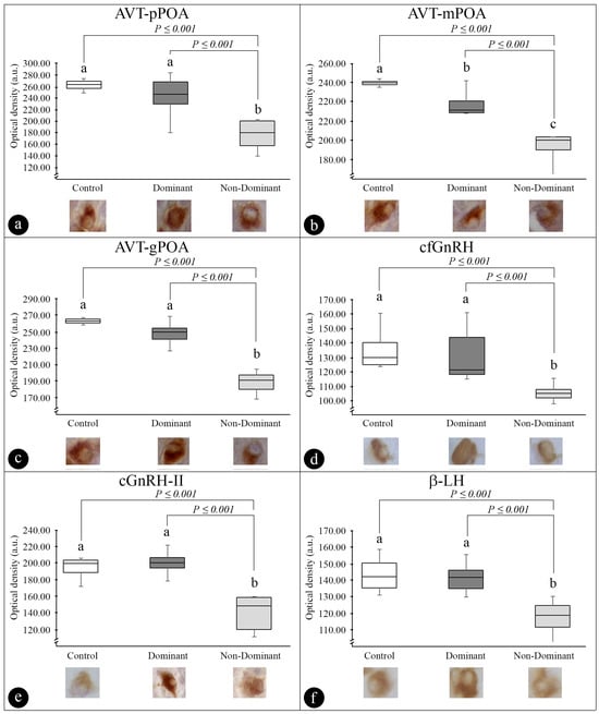 (a–f) Semiquantitative analysis (optical density (OD), a.u.) of immunohistochemistry of the arginine-vasotocin (AVT) and gonadotropin-releasing hormone (GnRH) neuronal system and gonadotropins (LH) of Steindachneridion parahybae in the different experimental groups, control, dominant, and nondominant females. (a) AVT-pPOA: parvocellular arginine-vasotocin subpopulation; (b) AVT-mPOA: magnocellular arginine-vasotocin subpopulation; (c) AVT-gPOA: gigantocellular arginine-vasotocin subpopulation; (d) cfGnRH: catfish gonadotropin-releasing hormone; (e) cGnRH-II: chicken-II gonadotropin-releasing hormone; (f) β-LH: β-luteinizing hormone. For AVT: n = 3 animals; n = 10 for OD of immunostaining per animal measured; totalizing 30 cells per experimental group; for cfGnRH and cGnRH-II: n = 3 animals; n = 8 for OD of immunostaining per animal measured; totalizing 24 cells per experimental group; for β-LH: n = 3 animals; n = 15 for OD of immunostaining per animal measured; totalizing 45 cells per experimental group. Values followed by different letters (a,b,c) represent significantly different (p < 0.05).