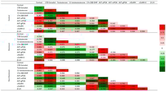 Pearson’s correlation coefficient matrix showing potential relationships between sexual steroids, cortisol plasma concentration and optical density (a.u.) of immunohistochemistry of the arginine-vasotocin (AVT), gonadotropin-releasing hormone (GnRH) neuronal system and gonadotropins (LH) of Steindachneridion parahybae in the different experimental groups, control, dominant, and nondominant females. The color of each box indicates the relationship between the various parameters examined in this study, with dark red indicating positive relationships and dark green indicating negative relationships. Abbreviations: AVT-pPOA: parvocellular arginine-vasotocin subpopulation; AVT-mPOA: magnocellular arginine-vasotocin subpopulation; AVT-gPOA: gigantocellular arginine-vasotocin subpopulation; cfGnRH: catfish gonadotropin-releasing hormone; cGnRH-II: chicken-II gonadotropin-releasing hormone; β-LH: β-luteinizing hormone; and 17α-20β-DHP: 17α-20β-dihydroxy-4-pregnen-3-one.