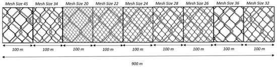 The nets used in this study had a total length of 900 m, consisting of 100-m panels for each of the nine mesh sizes. The height of each compartment was 100 meshes. The arrangement of mesh sizes for both GNSs and GTRs were randomly selected and are illustrated in Figure 2 and Figure 3. For longlines, each compartment had a length of 200 m and was equipped with 200 hooks (100 hooks per hook size). One compartment comprised of hook sizes 9 and 10, and two more compartments comprised of combinations of hook sizes 11–12 and 13–14, respectively.