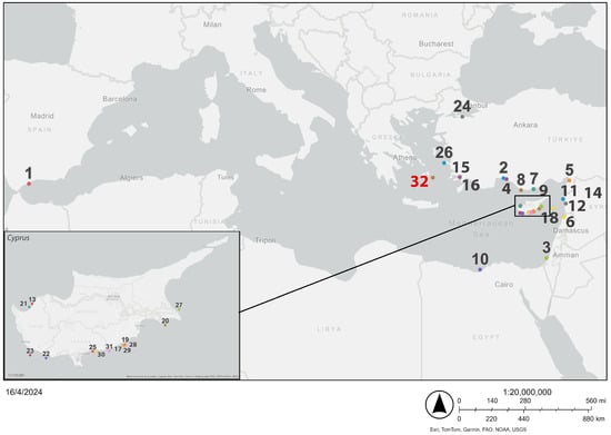 - Crocetta, F.; Al Mabruk, S.A.A.; Azzurro, E.; Bakiu, R.; Bariche, M.; Batjakas, I.E.; Bejaoui, T.; Ben Souissi, J.; Cauchi, J.; Corsini-Foka, M.; et al. “New Alien Mediterranean Biodiversity Records” (November 2021). Mediterr. Mar. Sci. 2021, 22, 724–746. [Google Scholar] [CrossRef]