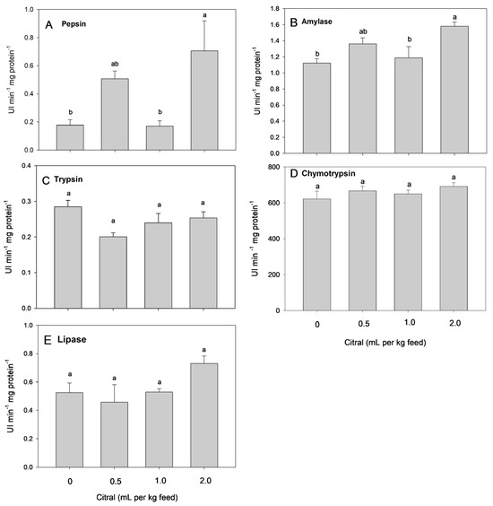 Pepsin activity in the stomach (A) and intestinal amylase (B), trypsin (C), chymotrypsin, (D) and lipase (E) activities in mullets fed different dietary citral levels for 45 days. Different superscript letters indicate significant differences between the treatments using one-way ANOVA and Tukey’s test (p < 0.05).
