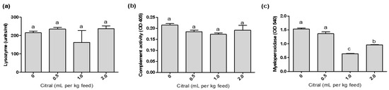 Plasma lysozyme activity, (a) hemolytic activity of complement system (b) and myeloperoxidase activity (c) in mullets fed different dietary citral levels for 45 days. Values are expressed as mean ± SEM (n = 3). Different superscript letters indicate significant difference between treatments using one-way ANOVA and Tukey’s test (p < 0.05).