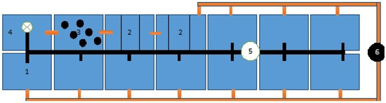 Recirculation aquaculture system: 1. Tanks; 2. Mechanical filter; 3. Biological filter; 4. Tank with pump; 5. Incoming water; 6. Outgoing water.
