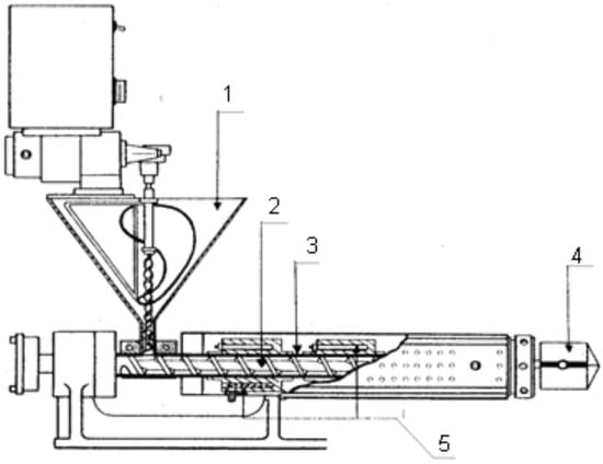 Single screw laboratory extruder—BRABENDER 20 DN: 1—feeding device; 2—working screw; 3—cylinder; 4—die with nozzle and heater; 5—heating devices; by Cherpokov et al. [39].