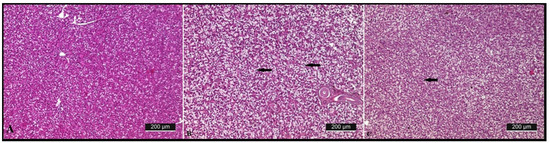 Microphotograph of the liver of rainbow trout (Oncorhynchus mykiss) fed with control diet (A), 50% algae meal (B), 100% algae meal (C).
