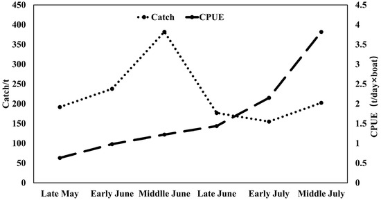 Fishery data statistics included fishing date (month and day), fishing location (longitude and latitude), daily catch (tons), and fishing effort (days). The timing of this catch was broken down into late May, early June, middle June, late June, early July, and middle July. Catch per unit effort (CPUE) can be used as an indicator to reflect the abundance of fishery resources [10,15]. In this study, CPUE was calculated by dividing the total catch of all vessels in different time periods by the total number of operating days of all fishing vessels in that time period, with the resulting value expressed in kg/day/boat. Equation (1) was calculated as follows. Purpleback flying squid catch locations were gridded separately at a resolution of 0.25° × 0.25°, with gridded CUPE data subsequently matched with environmental factors for a correlation analysis.