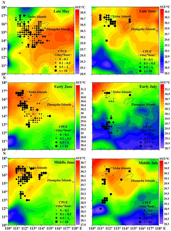 The CPUE is commonly assumed to be positively correlated with the abundance of fishery resources and is therefore a crucial indicator for assessing biomass [26]. In this study, our focus was on determining the distribution of CPUE for purpleback flying squid. The average CPUE for this species was 1.22 t/day × boat, with a gradual increase observed from May to July (Figure 2). The highest CPUE recorded was 3.82 t/day × boat in middle July, while the lowest CPUE was 0.63 t/day × boat in late May. It was found that the northeastern part of the study area exhibited a high level of fishing activity, particularly during the period from late May to June. Subsequently, after July, the focal point of intensive fishing shifted towards the western area within the 13–15° N latitude range. By analyzing the barycenter shift in the purpleback flying squid fishing ground, it was evident that the primary fishery area for this species during May to July was located between the southern Xisha Islands and western Zhongsha Islands. Moreover, there was a noticeable seasonal variation in its distribution, with a gradual northwestern and northern movement from middle May towards the western part of the Zhongsha Islands, followed by a subsequent southward shift after July. The distribution of the purpleback flying squid fishery varied seasonally [15]. The overall distribution of the fishery in the SCS exhibited a distinct north-to-south shift, characterized by patchy and sporadic patterns. During spring (March–June), the fishery was predominantly concentrated in the northern waters of the SCS. In summer (July–August), it was mainly located in the southwestern SCS waters. In fall (September–November), it was distributed in the south-central SCS waters, particularly along coastal areas where fishing conditions were favorable. In winter (December–February), there was a limited presence of resources within the SCS [19]. Based on the resource survey conducted by the South China Sea Fisheries Research Institute of the Chinese Academy of Fisheries Sciences in the SCS, it was found that during summer, the area with a high-density of purpleback flying squid was primarily situated in the area between 17–18° N, 113.5–115.5° E and 12.5–15.5° N, 115.5–117° E [19]. This observation revealed a significant overlap between the central fishing ground area and the area covered by our study. Furthermore, Yu et al. [4] investigated the spatial distribution in the sea area surrounding the Xisha and Zhongsha islands during spring, revealing the area’s significance as a crucial fishing ground for purpleback flying squid. The resource of this species gradually reached its peak in May, with the primary fishing ground located at 15–17° N, 110–112° E [27].
