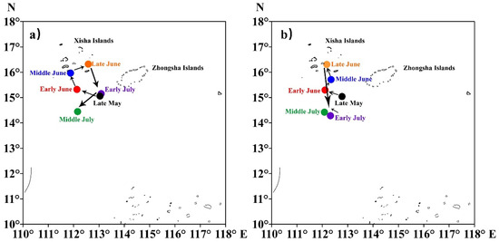 The fluctuations in the barycenter of the purpleback flying squid catch and CPUE indicated that the primary fishing grounds between May and July were located in the sea area encompassing the southern and western regions of the Xisha Islands. Moreover, there was a seasonal variation observed in these fishing grounds, gradually shifting northwestward and northward from the vicinity of the western part of the Xisha Islands towards late May, followed by a subsequent gradual shift southward after July (Figure 6).