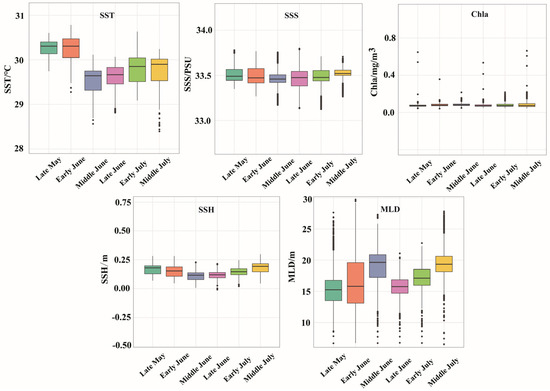 The variations in SST, SSS, Chla, SSH, and MLD for each period are presented in Figure 6. In terms of SST, the average SST was significantly higher in late May (30.26 °C) and early June (30.23 °C) than in the other periods. The mean SSS during the period from late May to middle July was 33.49, with minimal salinity fluctuations observed across the different time intervals. The average Chla for each time period was 0.08 mg/m3, indicating a consistently low level with no significant temporal or spatial variations. The mean SSH was highest in middle July at 0.18 m, followed by middle June at 0.15 m, and in terms of the spatial distribution, the sea area around the Xisha Islands was higher than the other sea areas. The MLD exhibited a sequential increase from late May (15.28 m) to late June (15.78 m), early June (16.31 m), early July (17.25 m), and middle June (18.86 m) and finally reached a peak in middle July (19.33 m). Figure 7 shows the distinct variations in the spatial distribution of the MLD.