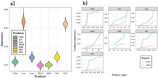 The GFA was first used to analyze the response of the purpleback flying squid catch and CPUE to SST, SSS, Chla, SSH, and MLD. Based on 1000 runs of the gradient forest, the results of 1000 simulations of the catch and CPUE have a fit of R2 = 0.018 (sd = 0.007) for catch and R2 = 0.307 (sd = 0.009) for CPUE. The GFA demonstrated that the variables had a stronger correlation with CPUE than catch alone, suggesting that the selected marine environmental factors were effective predictors of the variations in CPUE. Therefore, CPUE was selected as an indicator to represent the distribution of the purpleback flying squid resource, and the importance of each environmental factor in explaining CPUE variation was analyzed using gradient forests. After 1000 runs of the model, the results of the run with the highest R2 value were used to quantify the relationship between the marine environment and CPUE. The importance of each factor in explaining CPUE is shown in Figure 8, with longitude and SST having the highest importance, followed by SSS, latitude, Chla, SSH, and MLD. The intervals of the environmental indices with strong threshold responses to CPUE were 29.0–29.5 °C for SST, 33.0–33.2 for SSS, 0.05–0.10 m and 0.20–0.25 m for SSH, 16–20 m for MLD, and 0–0.2 mg/m3 for Chla (Figure 8).