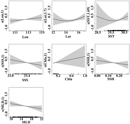 Additionally, we used a GAM to further analyze the CPUE data. The CPUE data of different periods were extracted and matched with the SST, SSS, Chla, SSH, and MLD of the corresponding time periods. The factors characterized by multicollinearity should be screened before model construction. The variance inflation factor (VIF) was applied to screen for multicollinearity characteristics among the explanatory variables added to the model. A value of VIF > 3 is generally considered to represent multicollinearity [22]. The selected factors based on the results of the VIF can all be added to the GAM for analysis (Table S1). The GAM was introduced to analyze the most influential factors affecting the distribution of the fishery with the purpleback flying squid CPUE as the response variable and SST, SSS, Chla, SSH, MLD, and season as the explanatory variables. Season was selected as the factor variable, with the final expression of the GAM model being as follows [23]: