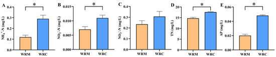 Water quality parameters in different cultural modes. * p < 0.05. (A), ammonia (NH4+-N); (B), nitrite (NO2−-N); (C), nitrate (NO3−-N); (D), total nitrogen (TN); (E), total phosphorus (TP). WRM, water rice monoculture; WRC, water rice–fish co-cultivation.