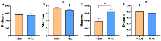 Alpha diversity index in different cultural modes. * p < 0.05. (A), richness; (B), Shannon; (C), Simpson; (D), evenness. WRM, water rice monoculture; WRC, water rice–fish co-cultivation.