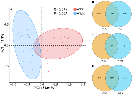 Venn diagrams were used to visualize the number of common and unique ASVs between the WRM and WRC groups. A total of 9524 ASVs were identified. Of these, 1435 ASVs were common to both groups, constituting approximately 15.07% of the total ASVs detected (Figure 3B). At the phylum level, the WRC group exhibited 41 phyla, whereas the WRM group harbored 47 phyla. Notably, there was an overlap of 39 phyla between the two groups (Figure 3C). At the genus level, the WRC group contained 883 genera, compared to 904 genera in the WRM group. There was a considerable commonality with 689 genera shared between both groups (Figure 3D).