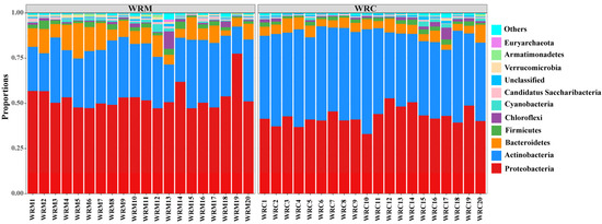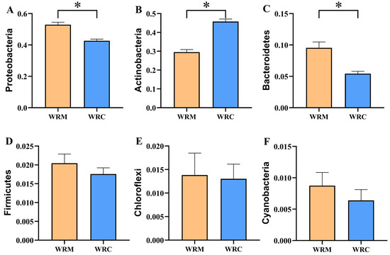 The bacterial composition at the phylum level is shown in Figure 4. The phylum-level composition of the predominant bacteria in both the WRM and WRC groups was similar, primarily consisting of Proteobacteria, Actinobacteria, and Bacteroidetes, together accounting for over 80% of the total bacteria. However, differences were observed in the relative abundance of these dominant phyla between the two groups. For example, Proteobacteria (52.91%) was the most prevalent phylum in the WRM group, while Actinobacteria (45.75%) exhibited the highest relative abundance in the WRC group. In particular, the differential analysis of the top six dominant bacteria revealed that the relative abundance of Proteobacteria and Bacteroidetes in the WRM group was significantly higher than that in the WRC group (p < 0.05; Figure 5A,C). Conversely, the relative abundance of Actinobacteria was markedly lower than that in the WRC group (p < 0.05; Figure 5B). Furthermore, there was no significant difference in the relative abundance of Firmicutes, Chloroflexi, and Cyanobacteria between the two groups (p > 0.05; Figure 5D–F).