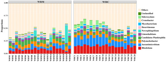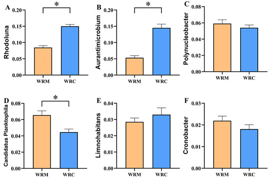 At the genus level (Figure 6), the dominant bacteria in the WRM group were Rhodoluna (8.47%), Candidatus Planktophila (6.56%), Polynucleobacter (5.92%), Aurantimicrobium (5.33%), and Novosphingobium (4.86%), whereas the dominant bacteria in the WRC group were Rhodoluna (15.01%), Aurantimicrobium (14.52%), Polynucleobacter (5.41%), Candidatus Planktophila (4.46%), and Sideroxydans (3.56%). The differential analysis of the top six dominant bacteria showed that the relative abundances of Rhodoluna and Aurantimicrobium in the WRM group were significantly lower than those in the WRC group (p < 0.05; Figure 7A,B), while the relative abundance of Candidatus Planktophila was markedly higher than that in the WRC group (p < 0.05; Figure 7D) after 60 days of farming. In addition, the relative abundances of Polynucleobacter, Limnohabitans, and Cronobacter showed no difference (p > 0.05; Figure 7C,E,F).