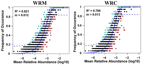 Neutral community model in the water bacterial communities. The parameter “m” denotes immigration, and the value of “R2” represents the goodness of fit to the model. WRM, water rice monoculture; WRC, water rice–fish co-cultivation. The ASVs from each data were categorized into three partitions based on their frequency of occurrence relative to the predictions of the neutral community model: those occurring more frequently than (above partition, green dot), less frequently than (below partition, red dot), or within (neutral partition, black dot) the 95% confidence interval (blue solid line).