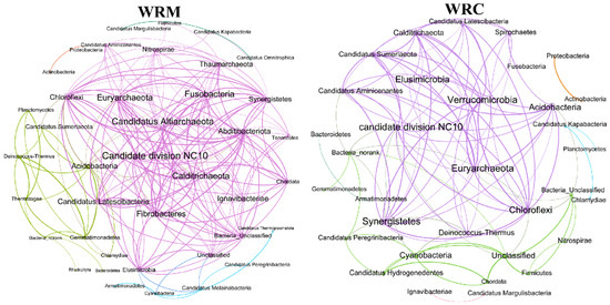 Co-occurrence networks in the water bacterial communities. WRM, water rice monoculture; WRC, water rice–fish co-cultivation.