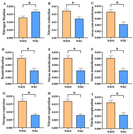 We selected twelve functions related to inorganic nitrogen conversion for differential analysis (Figure 10). Differential analysis showed that the relative abundance of nitrogen fixation in the WRM group was significantly lower than that in the WRC group (p < 0.05, Figure 10A). Nevertheless, the relative abundances of nitrate reduction, nitrous oxide denitrification, denitrification, nitrate denitrification, nitrite denitrification, nitrogen respiration, nitrate respiration, and nitrite respiration in the WRM group were markedly higher than those in the WRC group (p < 0.05, Figure 10B–I).
