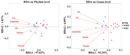It has been reported that environmental factors directly affect the composition of the bacterial community [56,57,58]. Yang et al. (2017) found that Actinobacteria was positively correlated with the contents of NH4+-N, NO2−-N, NO3-N, TN, and TP [59]. Similarly, in this study, the contents of all environmental factors had a significant positive correlation with Actinobacteria after 60 days of farming. Some studies have shown that TN is negatively correlated with bacterial abundance, such as Bacteroidetes [60] and Proteobacteria [61,62], which is supported by our data. Meanwhile, our study found that ammonia, nitrite, and TN were significant positively correlated with Rhodoluna and Aurantimicrobium, which indicates that the differences in environmental factors significantly affected the relative abundance of dominant bacteria in the different cultural systems. In addition, the study showed that the relative abundances of nitrate reduction, nitrous oxide denitrification, denitrification, etc., in the WRM group were markedly higher than those in the WRC group. We speculate that common carp cultivation causes an increase in the concentrations of total nitrogen and nitrite. Therefore, the demand for bacteria to obtain nitrogen through other pathways is reduced, resulting in a decrease in the abundance of various functions related to nitrogen.