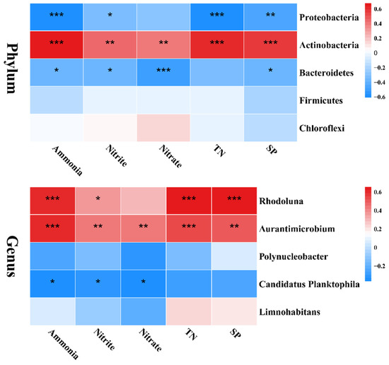 RDA combines correspondence analysis and multiple regression on the basis of linear modes, which can intuitively see the relationship between samples and environmental factors. At the phylum level, the contribution rates of the X-axis and Y-axis were 96.21% and 3.46%, respectively, accounting for a total of 99.67% of the community changes (Figure 11). At the genus level, the contribution rates of the X-axis and Y-axis were 91.11% and 7.13%, respectively, accounting for a total of 98.24% of the community changes (Figure 11). In addition, all environmental factors had a significant positive correlation with Actinobacteria, Aurantimicrobium, and Rhodoluna (p < 0.05; Figure 12). However, ammonia, nitrite, and nitrate had a significant negative correlation with Bacteroidetes (p < 0.05; Figure 12). Ammonia, nitrite, TN, and PO43− were significantly negatively correlated with Protebacteria (p < 0.05; Figure 12). Ammonia, nitrite, and nitrate had a significant negative correlation with Candidatus Planktophila (p < 0.05; Figure 12).