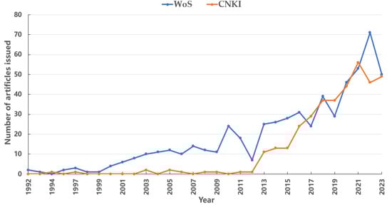The databases used were WoS and CNKI. WoS was chosen because it covers more than 20,300 scientific journals, books, and conferences, as well as more than 71 million items of research material [55,56]. In addition, CNKI covers more than 90% of China’s knowledge information resources [57].