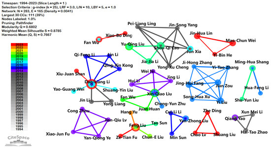 The number of publications by authors reflects trends in research topics and academic interest in smart fisheries. CiteSpace software (version 6.2.R4) was used to analyze and draw the knowledge graph of authors of smart fisheries publications in the CNKI and WoS databases. Each node in the graph represents a researcher, and the connecting lines between nodes represent the collaboration network of researchers. Then, the filtered documents are imported into CiteSpace software (version 6.2.R4) and the author (Author) node is screened. The selection criteria were the top 50 in each time zone, i.e., the authors with the highest number of citations. The time span was set to 1994–2023, the time slice was one year, k in the scale factor size index was set to 25, and Top50 was a single-year search threshold, using the default algorithm. The network clipping method was “Pathfinder + Pruning slicing network”. Finally, the statistics of the number of articles published by core authors and the co-occurrence map of core authors were obtained. According to Price’s law formula: m = 0.749 (Nmax refers to the highest number of published articles). Therefore, higher values represent more productive and influential authors in the field.
