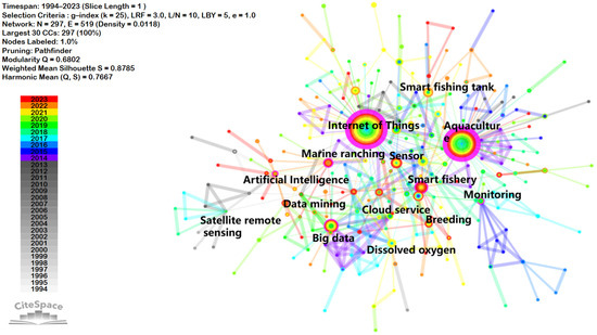 In Figure 4, each node corresponds to a keyword. The larger the node in the graph, the more references to that keyword. The brighter the color, the more popular the keyword has been in recent years. The radius of the node indicates the frequency of the keyword appearing in the imported data. The larger the node radius, the more times the keyword is cited and the wider its scope. Among them, the two keywords, “Aquaculture” and “Internet of Things”, are relatively prominent. In addition, the connecting lines between nodes indicate that keywords appear together in the same document. More connecting lines indicate a greater number of connections between each keyword, meaning that it is more popular in the field and can attract more attention.