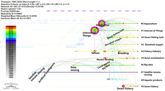 Closely related keywords are clustered by the cluster map, and then each keyword is assigned a value, while the maximum value in the same cluster serves as their label. Based on the mapped keywords, a total of 35 clusters were generated, and the top 10 larger clusters were selected to analyze hot spots and trends, namely aquaculture (#0), Internet of Things (#1), smart fishing Tank (#2), dissolved oxygen (#3), fishery industry (#4), rural revitalization (#5), big data (#6), satellite remote sensing (#7), aquatic products (#8), and smart fishery (#9). Then, the frequency and year information of relevant representative keywords contained in each cluster are counted and tabulated (Table 3). On this basis, a timeline map is drawn by arranging cluster labels sequentially on the timeline (Figure 5). The occurrence of a keyword in each row represents the keyword that appears more frequently in that cluster and the first year that the keyword appears in the selected database. The lines between keywords indicate that they appear in the same literature.