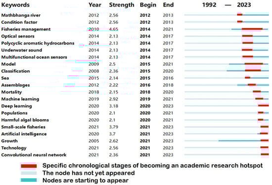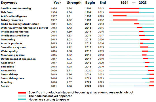 Through keyword co-occurrence mapping, the 21 most prominent keywords are selected for mapping, sorted by time. The red area indicates that the keyword is in the research hotspot period. In the first stage, satellite remote sensing is the main keyword, while water quality monitoring, intelligent monitoring, and monitoring system are the main keywords. In the second stage, aquaponics, smart fish tanks, and other aquaculture modes are the research hotspots.