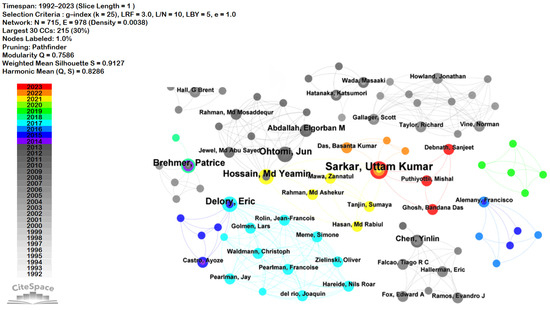 In the analysis of institutions, the following are the relevant settings. “Institution” was selected as the node type, 1 year was selected as the time slice, and the time span was 1992–2023, with the others kept as default.