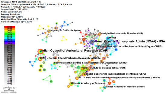 In order to compare the differences in the number of publications between Chinese institutions and non-Chinese institutions, the database collected using the WoS database was also used. A total of 13 institutions produced more than eight publications. Five institutions ranked among the top five, namely the Indian Council of Agricultural Research (ICAR), National Oceanic Atmospheric Admin (NOAA)—USA, ICAR—Central Inland Fisheries Research Institute, Centre National de la Recherche Scientifique (CNRS), and Ifremer (Table 5). Two Chinese institutions ranked seventh and 11th, respectively, namely the Chinese Academy of Sciences and the Chinese Academy of Fishery Sciences (Table 5).