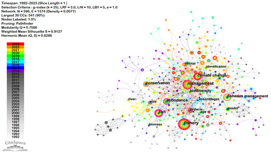 In the WoS Core Collection database, with the subject set to =((((TS = (fishery)) AND TS = (Smart fishery)) OR TS = (Digital fishery)) OR AK = (Smart fishery)) OR AK = (Fishing forecast), a total of 579 journal articles between 1992–2023 were obtained from the WOS Core Collection database search. In data export mode, select plain text mode and choose full record and cited references for export, saving the export in the “download_.TXT” mode for subsequent visualization and analysis of the literature using Citespace. The search was open until 30 December 2023.