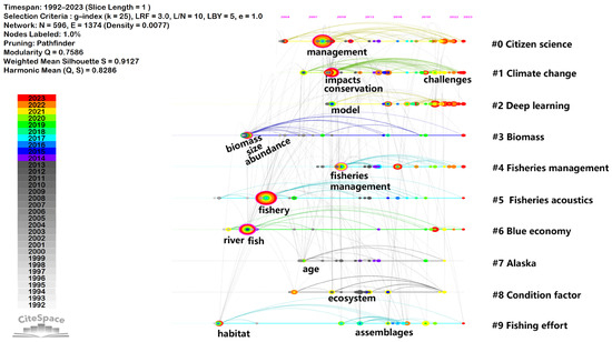 In the second stage (2013–2023), IoT technology is increasingly used in fisheries and aquaculture, developing in the direction of intelligence and automation. The clustered keywords are aquaculture (#0), IoT (#1), Intelligent Fish Tank (#2), dissolved oxygen (#3), Fishery industry (#4), Rural revitalization (#5), Big Data (#6), Aquatic products (#8), and Smart fishery (#9).