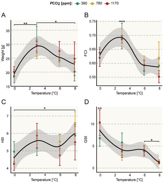 - Lopes, A.F.; Faria, A.M.; Dupont, S. Elevated temperature, but not decreased pH, impairs reproduction in a temperate fish. Sci. Rep. 2020, 10, 20805. [Google Scholar] [CrossRef]