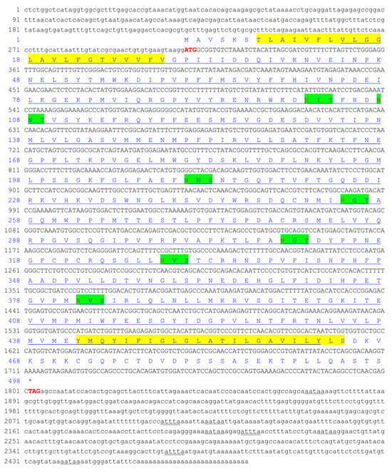 Nucleotide and putative amino acid sequences of CiSRB1. Nucleotide (lower row) and putative amino acid (upper row) sequence numbers are shown on the left. The start codon (ATG) and stop codon (TAG) are highlighted in bold red. The mRNA instability motif (ATTTA) is double-underscored, and the poly-adenylation signal sequence (AATAA) is shown with a wavy line. Transmembrane regions are marked with yellow backgrounds. The CD36 domain is underscored. Asn-Xaa-Ser/Thr sequons are highlighted in green background, and Asn residues predicted to be N-linked glycosylation sites are highlighted in red. * indicates that amino acids stop being produced.