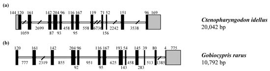 - Wang, Y.; Lu, Y.; Zhang, Y.; Ning, Z.; Li, Y.; Zhao, Q.; Lu, H.; Huang, R.; Xia, X.; Feng, Q.; et al. The draft genome of the grass carp (Ctenopharyngodon idellus) provides insights into its evolution and vegetarian adaptation. Nat. Genet. 2015, 47, 625–631. [Google Scholar] [CrossRef] [PubMed]