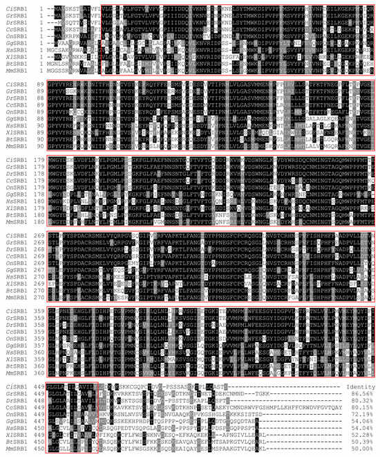 Multiple-sequence alignments of SRB1 proteins from different species. The dark shade indicates 100% identity, and the gray shade indicates 50% identity. The CD36 domain is highlighted in a red box. CiSRB1 denotes SRB1 in C. idellus, GrSRB1 denotes SRB1 in G. rarus, DrSRB1 denotes SRB1 in D. rerio, CcSRB1 denotes SRB1 in C. carpio, OnSRB1 denotes SRB1 in O. niloticus, GgSRB1 denotes SRB1 in G. gallus, XlSRB1denotes SRB1 in X. laevis, HmSRB1 denotes SRB1 in H. sapiens, BtSRB1 denotes SRB1 in B. taurus, and MmSRB1 denotes SRB1 in M. musculus.