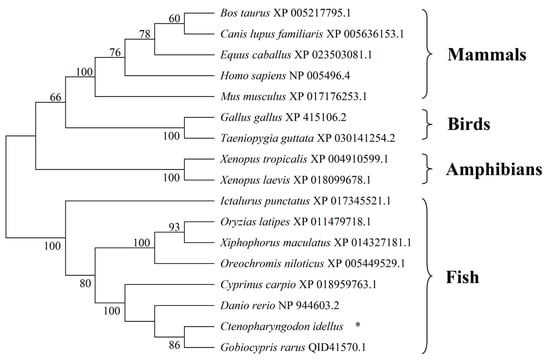 Neighbor-joining phylogenetic tree analysis of SRB1 proteins in vertebrates. The tree was constructed based on amino acid sequences of grass carp SRB1 and 16 orthologs by using MEGA 7.0 software. The GenBank accession numbers of the SRB1 proteins are given after the species names in the tree. * represents SRB1 in C. idellus.